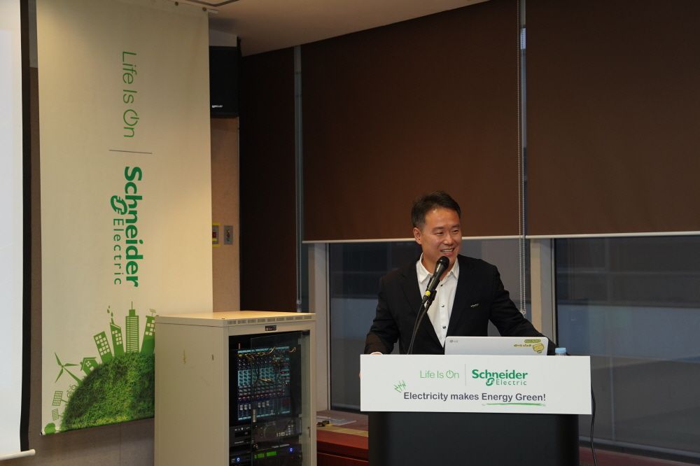 송인권 슈나이더 일렉트릭 코리아 팀장이 15일 서울 강남구 코엑스에서 열린 기자간담회에서 회사의 스마트 전력 솔루션을 소개하고 있다. 슈나이더 일렉트릭