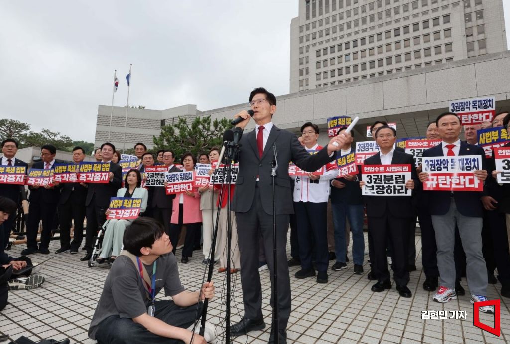 김문수 국민의힘 대선 후보가 15일 서울 서초구 대법원 앞에서 열린 사법부 수호 및 민주당 규탄대회에서 발언하고 있다.