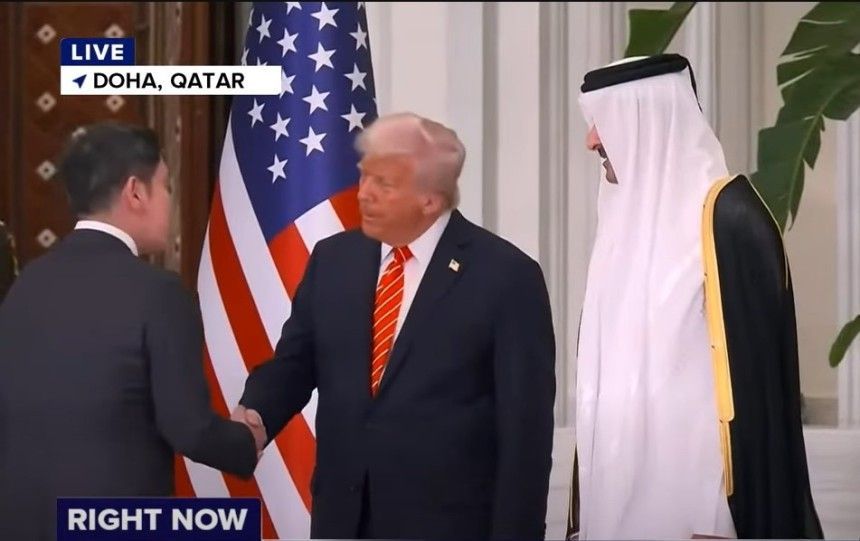 14일(현지시간) 셰이크 타밈 빈 하마드 알사니 카타르 군주가 주최한 국빈만찬에 앞서 도널드 트럼프 미국 대통령(가운데)과 악수하는 정용진 신세계그룹 회장의 뒷모습. 미 ABC방송 유튜브 화면 캡처