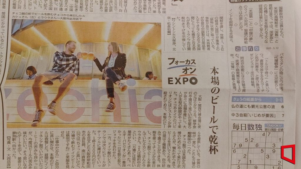 일본 오사카에서 열리고 있는 '2025 오사카·간사이 세계엑스포(만국박람회)'와 관련해, 일본 마이니치 신문은 지난 12일 1면에 '포커스 온 엑스포'란 코너를 싣고 "본고장의 맥주로 건배"란 제하로 맥주를 마시기 위해 관람객이 운집한 독일, 체코의 전시관 소식을 다뤘다. 이 기사에 따르면, 독일과 체코는 저녁 시간이 되면 자국의 국가관을 찾은 관람객들에게 맥주를 큰 유리컵에 담아 제공했다. 저녁 식사 후 독일, 체코산 맥주로 이날 하루를 마무리하려던 관람객들이 많았다고 전했다.