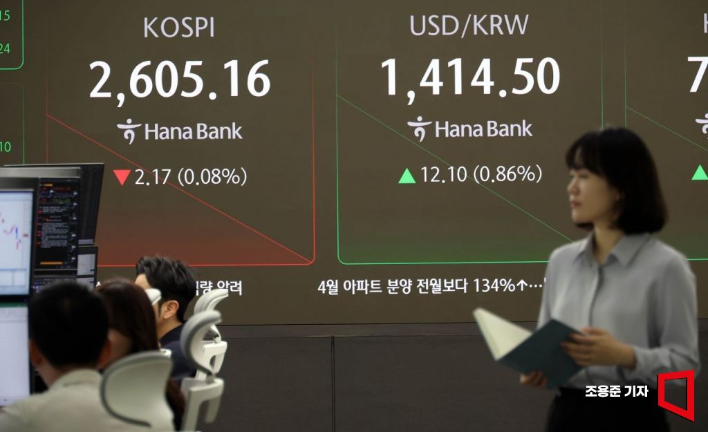 미중 상호관세 합의에 미국 뉴욕 증시가 일제히 급등 소식에도 코스피는 약보합으로 출발한 13일 서울 중구 하나은행 본점 딜링룸 현황판에 코스피와 원/달러 환율 등이 표시돼 있다. 이날 코스피는 전장보다 1.83포인트 오른 2,609.16으로 원/달러 환율은 12.6원 오른 1415.0원 장을 시작했다. 2025.5.13 조용준 기자