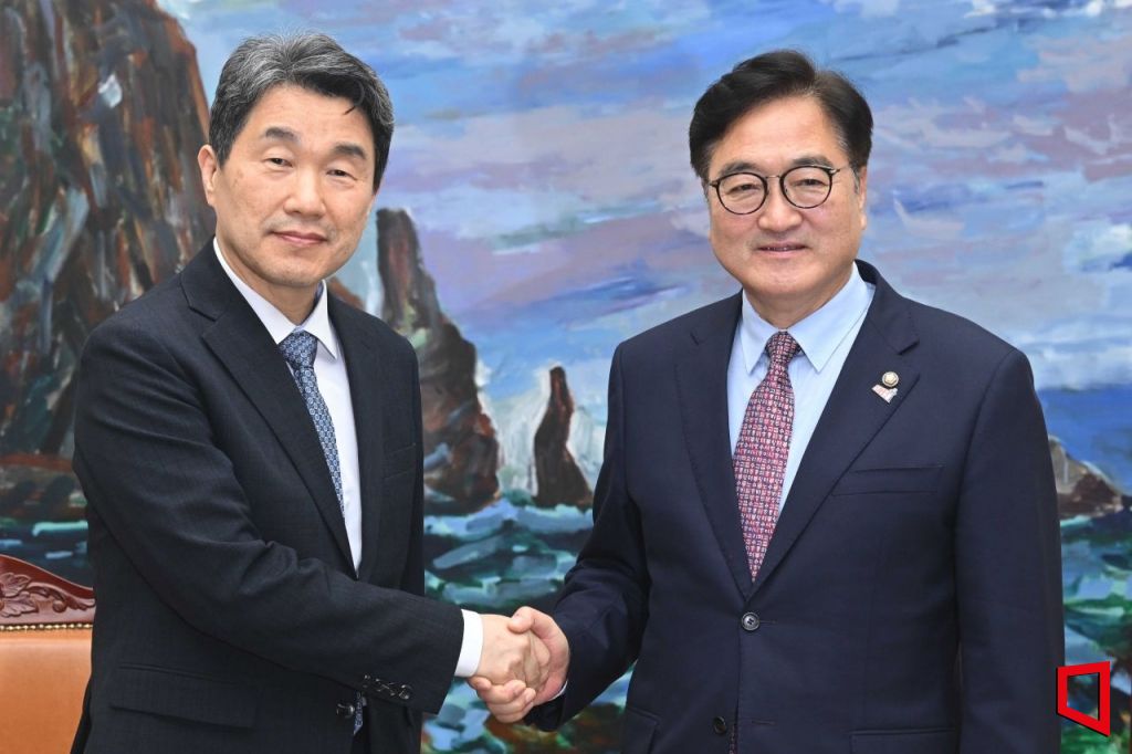 우원식 국회의장과 이주호 대통령 권한대행 부총리 겸 교육부 장관이 15일 국회에서 만나 악수하고 있다. 2025.5.15 국회사진기자단