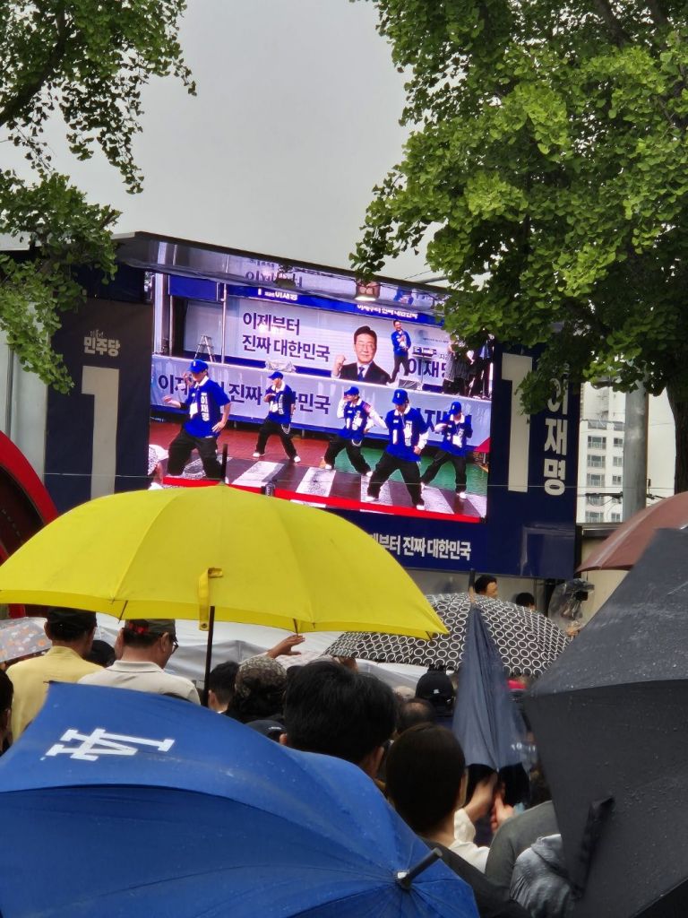 15일 순천시 패션 거리에서 더불어민주당 선거운동원들이 이재명 후보 유세에 앞서 노래에 맞춰 율동을 하고 있다. 독자 제공