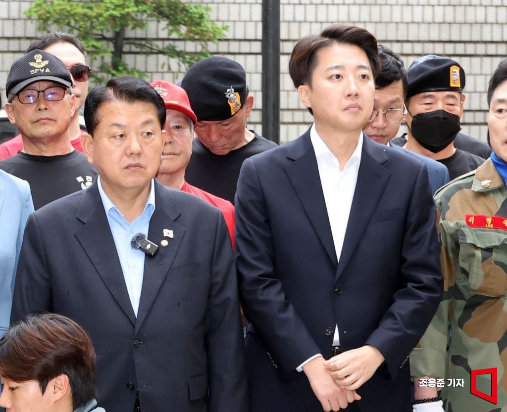 개혁신당 이준석 대선후보가 16일 서울 서초구 서울중앙지방법원 앞에서 박정훈 대령의 채상병 사건 관련 2심 준비공판을 앞두고 열린 기자회견에 참석하고 있다.