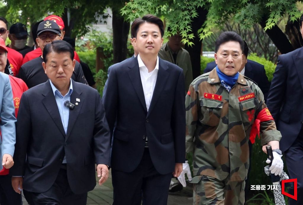 [포토] 박정훈 대령 2심 준비공판 기자회견 참석하는 이준석 후보