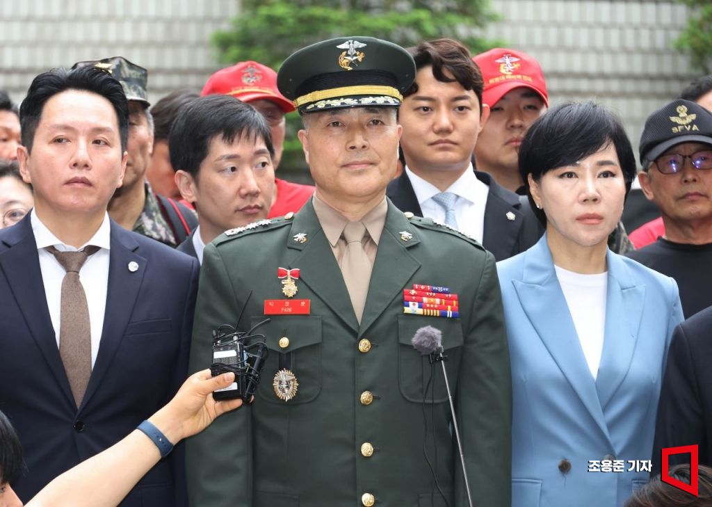 해병대 채모 상병 순직 사건과 관련해 1심에서 무죄를 선고받은 박정훈 전 해병대 수사단장(대령)이 16일 서울 서초구 서울고등법원에서 열린 항소심 2차 공판준비기일에 출석하며 기자회견을 하고 있다.