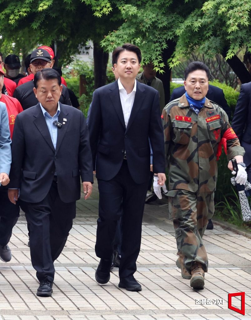 개혁신당 이준석 대선후보가 16일 서울 서초구 서울중앙지방법원 앞에서 박정훈 대령의 채상병 사건 관련 2심 준비공판을 앞두고 열린 기자회견에 참석하고 있다.