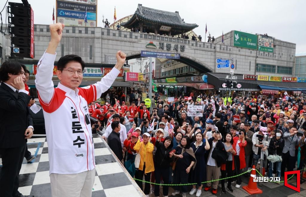 김문수 국민의힘 대선 후보가 16일 경기 수원시 지동시장 앞에서 유권자들을 향해 인사하고 있다.