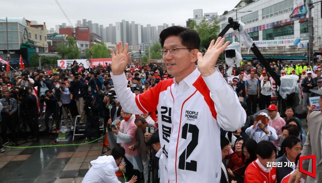 국민의힘 김문수 대선 후보가 16일 경기 수원시 지동시장에서 열린 유세에서 시민들에게 지지를 호소하고 있다. 연합뉴스