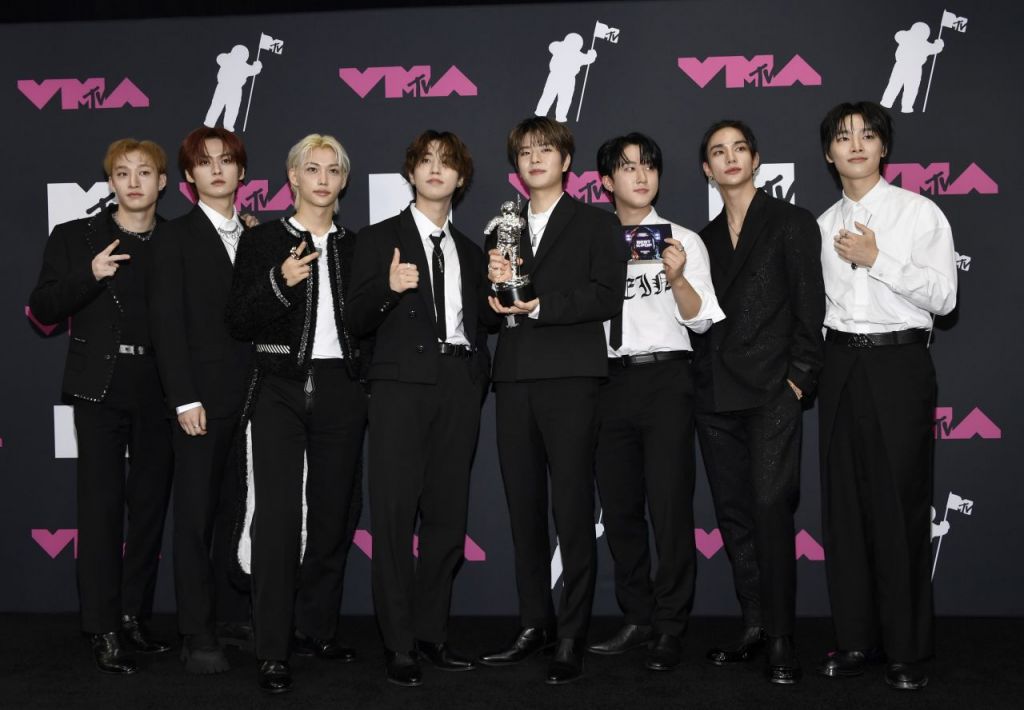 그룹 스트레이키즈가 2023년 9월 미국 뉴저지주 뉴어크 푸르덴셜 센터에서 열리는 '2023 MTV 비디오 뮤직 어워즈'(MTV VMA)에서 '베스트 K팝' 부문을 수상한 뒤 트로피를 들고 있다. AP연합뉴스