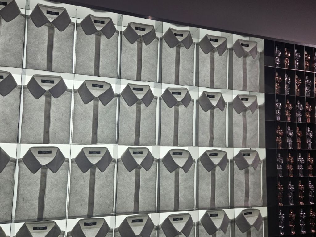 프랑스 패션 브랜드 '칼 라거펠트'가 서울 성수동 팝업스토어 개최를 기념해 한지로 제작한 하얀색 와이셔츠들이 벽면 한쪽을 가득 메우고 있다. 사진=박재현 기자