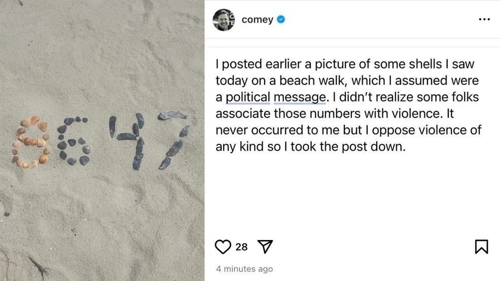 코미 전 국장은 단순한 정치적 메시지였다고 해명하며 논란이 된 게시물을 삭제한 상태다. 코미 전 국장은 "아까 나는 오늘 해변 산책로에서 본 조개들의 사진을 올렸는데, 나는 그것이 정치적 메시지라고 여겼다"며 "나는 어떤 사람들이 이 숫자들을 폭력과 연관시킨다는 점을 깨닫지 못했다. 그런 생각은 해 본 적이 없지만 모든 폭력에 반대하기 때문에 게시물을 내렸다"고 썼다.