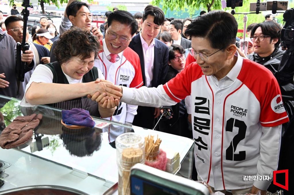 김문수 국민의힘 대선 후보가 16일 경기 수원시 지동시장 유세를 마친 뒤 시장상인들에게 지지를 호소하고 있다.