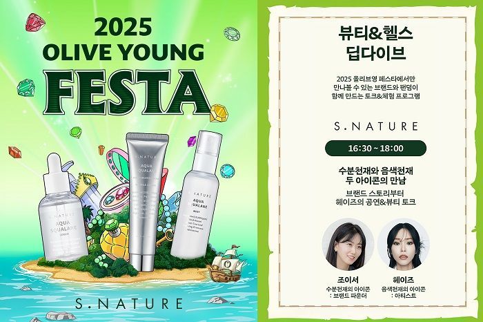 더불어 올리브영 페스타 마지막날인 25일 16시30분부터 약 1시간 동안 노들섬 라이브 하우스에서 '뷰티&헬스 딥다이브' 행사에서 에스네이처 브랜드 단독 세션을 개최할 예정이다.