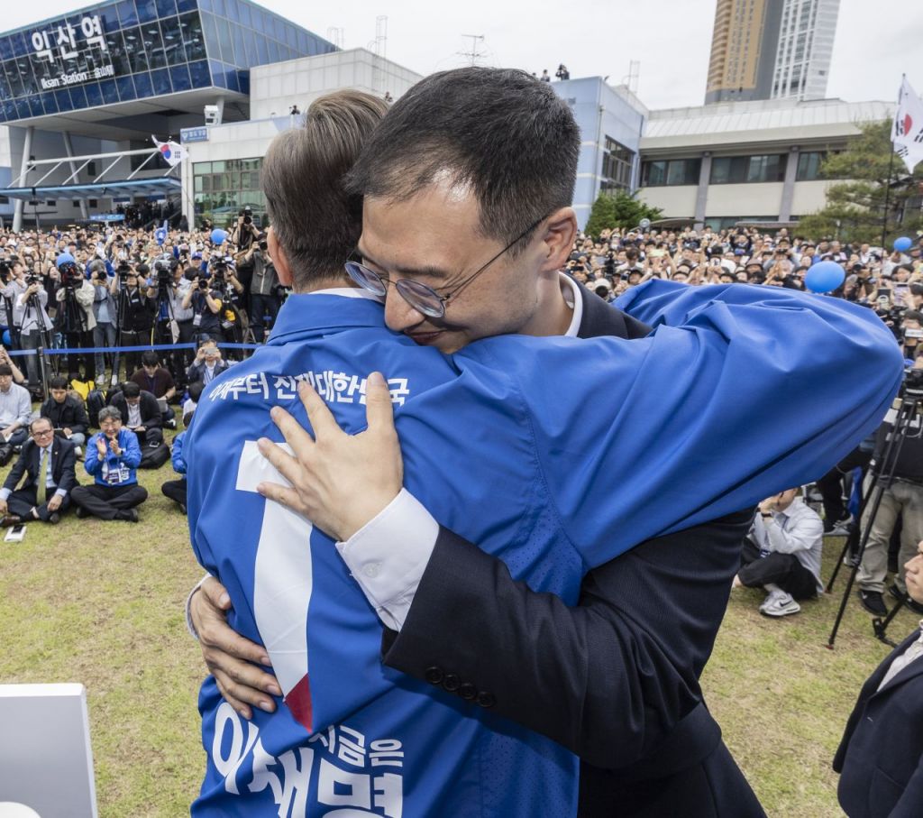 이재명 더불어민주당 대선후보가 전북 유세 현장에서 국민의힘 탈당 이후 이 후보 지지를 선언한 김상욱 무소속 의원을 끌어안았다. 이 후보는 "이분(김 의원)이 보수의 진정한 가치, 합리적 정치를 민주당 안에서 실현할 수 있도록 힘을 줬으면 한다"고 지지자들을 향해 말했다.