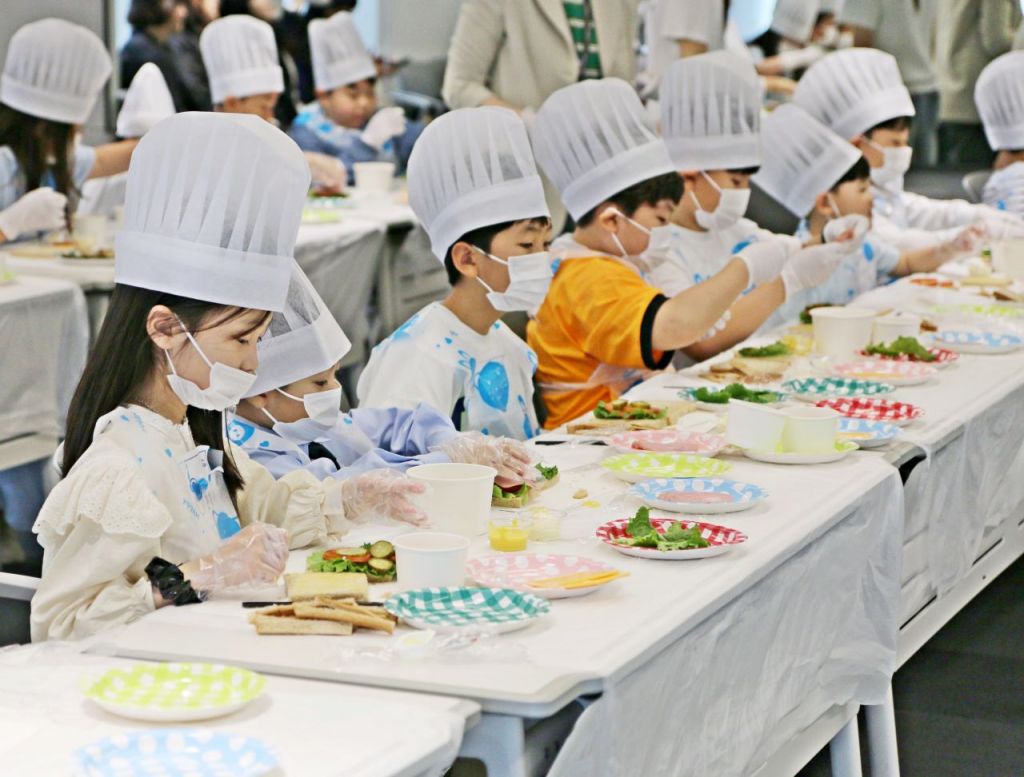 에어부산 본사에서 진행된 가족 초청 '패밀리데이' 행사에 참여한 임직원 자녀들이 기내식 만들기 체험을 하고 있다.