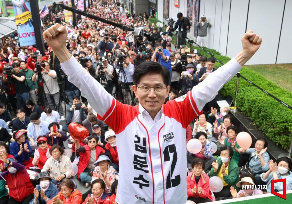 김문수 국민의힘 대선 후보가 16일 충남 천안시 신세계백화점 앞 광장에서 유권자들에게 지지를 호소하고 있다.