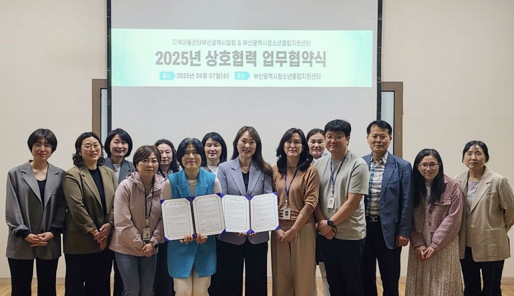 지난 9일, 부산시청소년종합지원센터에서 부산시청소년종합지원센터 최선경 관장, 부산시일시청소년쉼터(고정형) 이혜영 소장, 부산시일시청소년쉼터(이동형) 김복희 소장, 부산시남자단기청소년쉼터 전선영 소장, 부산시청소년자립지원관(혼합형) 장주현 소장, 학교폭력예방회복조정센터 장은선 소장, 청소년성문화센터 정주비 센터장과 지역아동센터 부산시협회 박선희 협회장과 직원이 참석한 가운데 업무협약식이 진행됐다.