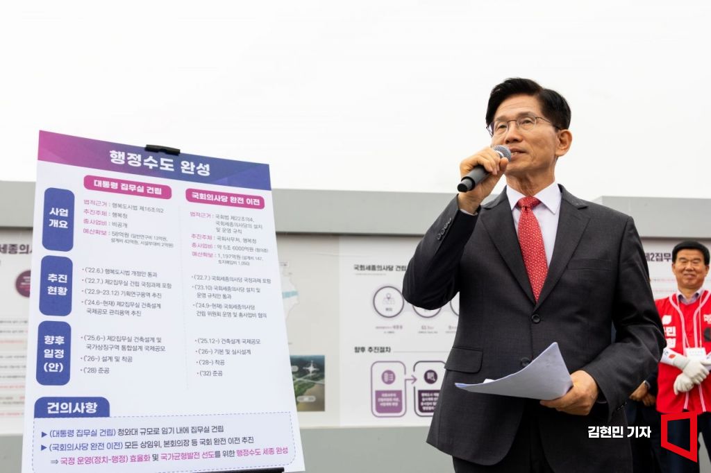 김문수 국민의힘 대선 후보가 16일 국회 세종의사당 부지에서 국회 이전 관련 행정수도 공약을 발표하고 있다.