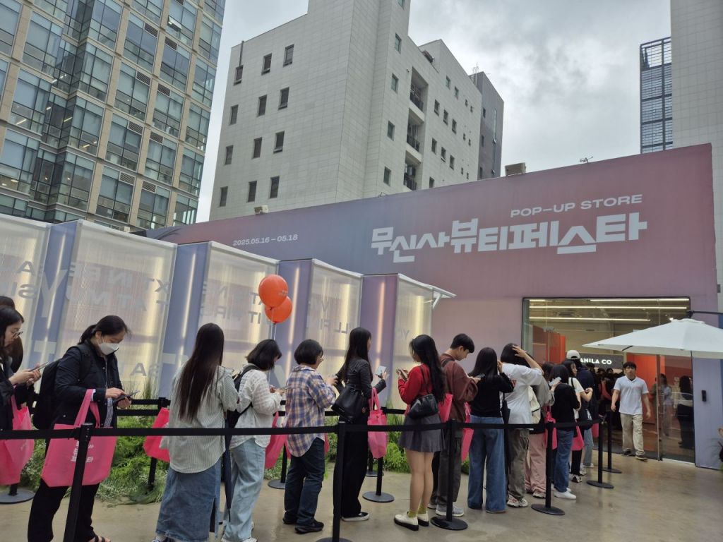 빗줄기가 오락가락한 16일 서울시 성동구 '무신사 스퀘어 성수 4' 앞은 핑크(코랄)색 부직포 가방을 멘 여성 고객의 대기줄로 장사진을 이뤘다. 무신사가 이날부터 사흘간 '무신사 뷰티페스타'를 개최하면서 수백명의 방문객들이 몰린 것이다.