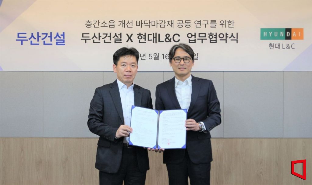 두산건설은 종합 건자재 기업 현대L&C와 층간소음 개선을 위한 바닥 마감재 공동 연구 업무협약(MOU)을 체결했다고 16일 밝혔다.