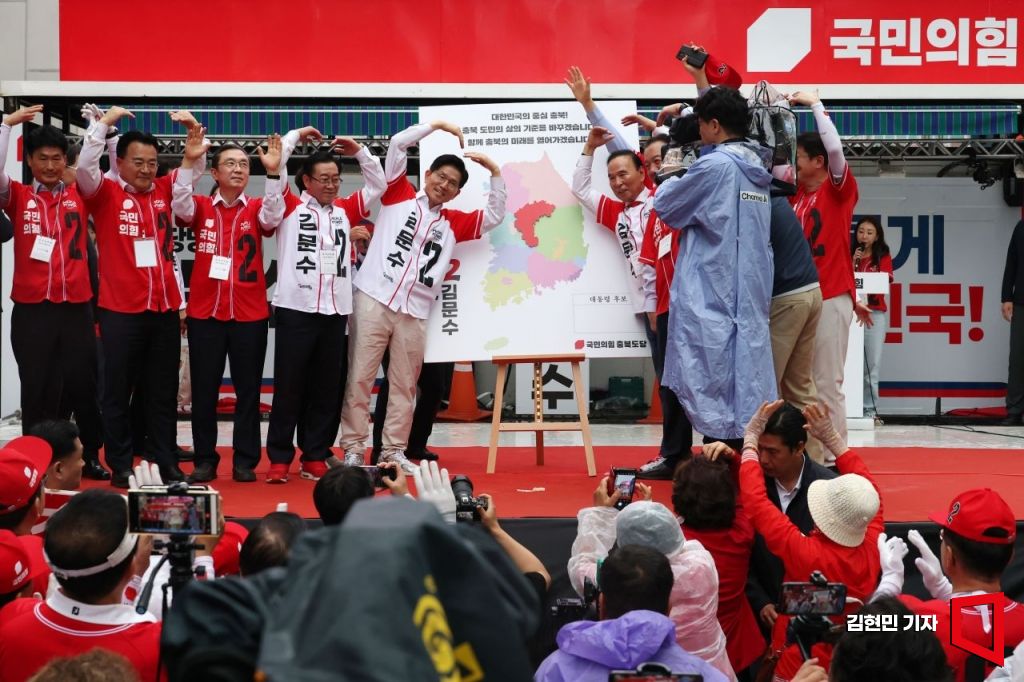 김문수 국민의힘 대선 후보가 16일 충북 청주시 청주타운에서 집중유세를 하며 충청도에 퍼즐 스티커를 붙이는 퍼포먼스를 하고 있다.