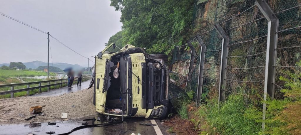 트럭 운전자 50대 남성도 중상을 입고 병원에 이송됐으며 사고 충격으로 덤프트럭은 오른쪽으로 넘어졌다.
