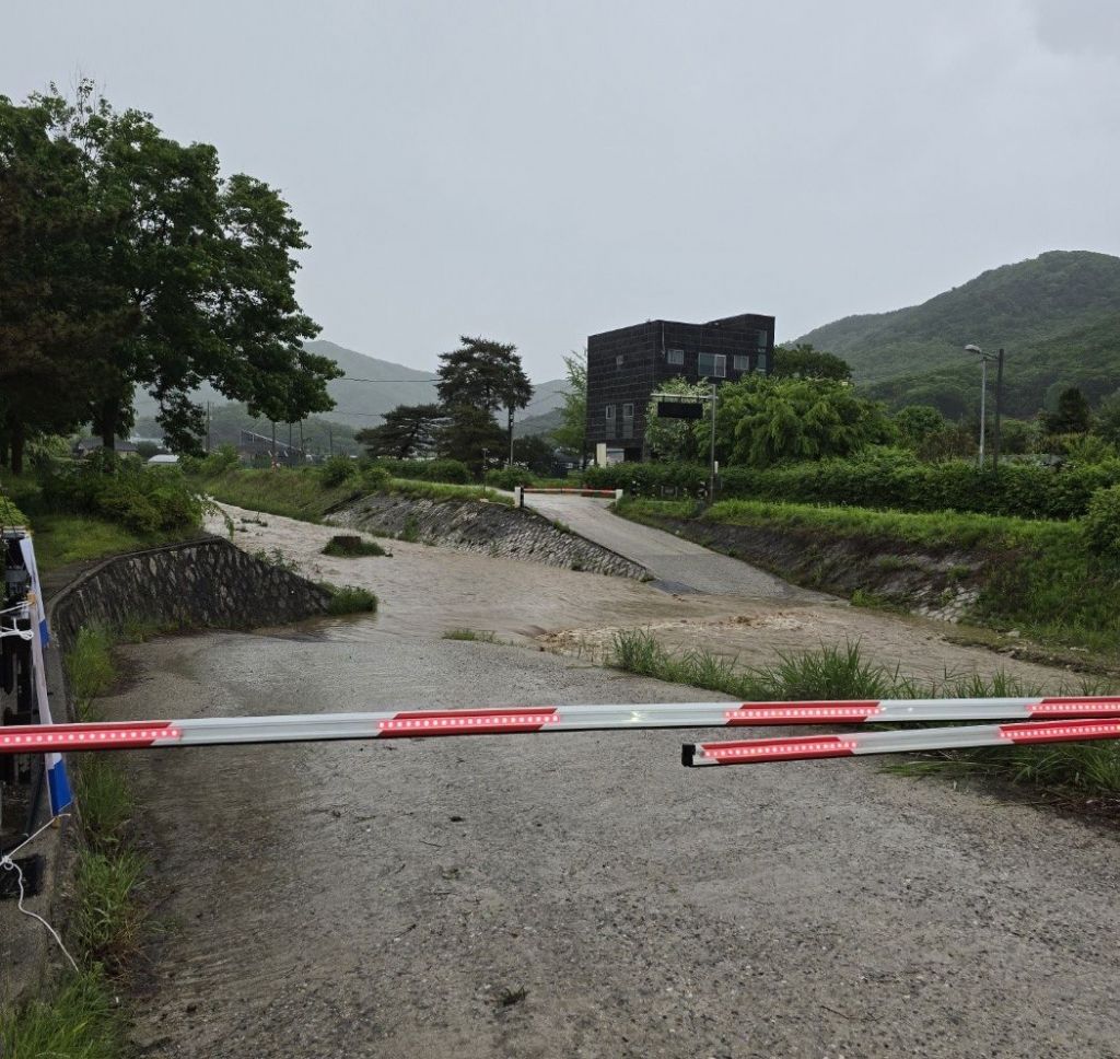 16일 경기 남양주시 전역에 호우경보가 발효된 가운데 최대 120㎜(오남 기준)의 집중호우가 기록되고 오후 4시부터 9시까지 최대 31㎜의 추가 강우가 예보됨에 따라 선제적 대응을 위해 하천도로를 차단하고 있다. 남양주시 제공