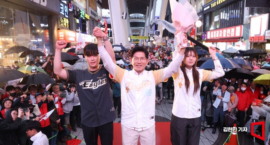 김문수 국민의힘 대선 후보가 16일 대전 중구 으능정이문화의거리에서 시민이 선물한 프로야구 한화 이글스 유니폼을 입고 기념촬영하고 있다.