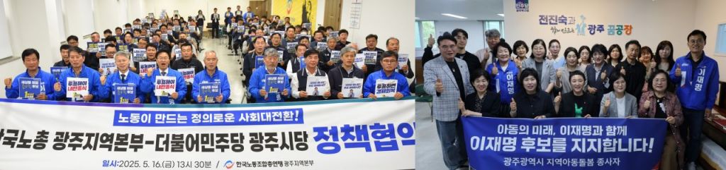 16일 광주지역 각계각층에서 이재명 후보에 대한 지지 선언이 이어진 가운데 노동계와 장애계도 지지 선언에 나섰다. 사진 왼쪽부터 한국노총과 북구지역아동센터의 지지 선언. 더불어민주당 광주선대위 제공