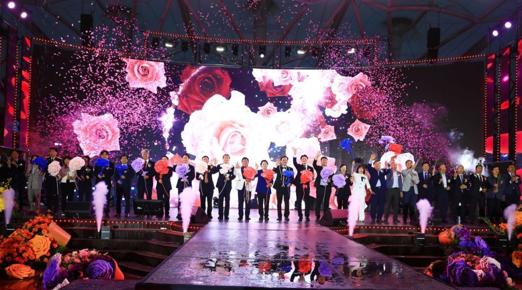 곡성군섬진강기차마을 중앙무대에서 조상래 군수를 비롯한 행사 관계자들이 제15회 곡성세계장미축제 개막을 알리고 있다. 곡성군 제공