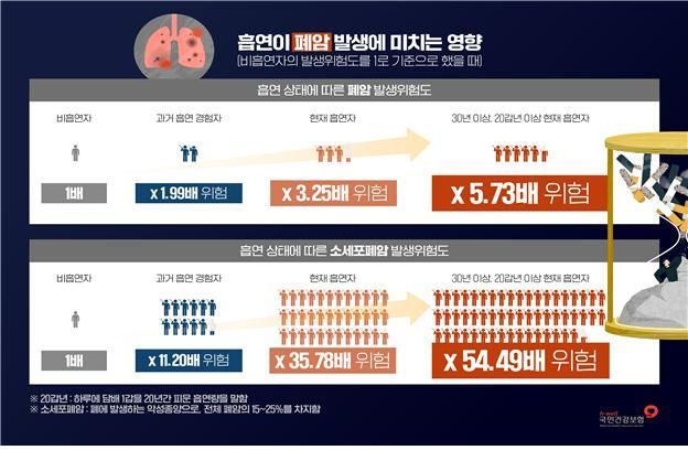 18일 국민건강보험공단 건강보험연구원과 연세대학교 보건대학원의 공동 연구 결과에 따르면 30년 이상, 20갑년(하루 한 갑×20년) 이상 흡연한 경우 비흡연자에 비해 소세포폐암 발생 위험이 54.49배 높고 소세포폐암 발생에 흡연이 기여하는 정도는 98.2% 수준인 것으로 밝혀졌다.