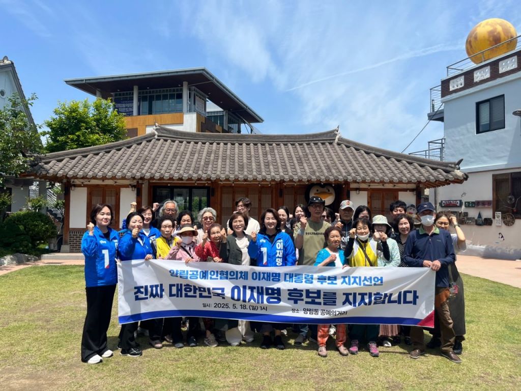 양림공예인협의체는 이날 오후 남구 양림동 펭귄마을 공예거리에서 "'진짜 대한민국, 이재명 후보를 지지한다', '지금은 이재명'" 등을 외치며 지지 의사를 밝혔다.