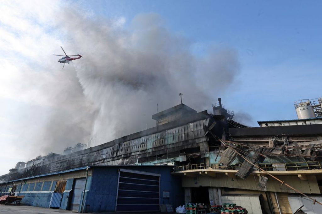 금호타이어 광주공장 화재 발생 이틀째인 18일 소방 헬기가 상공을 돌며 불을 끄고 있다. 연합뉴스