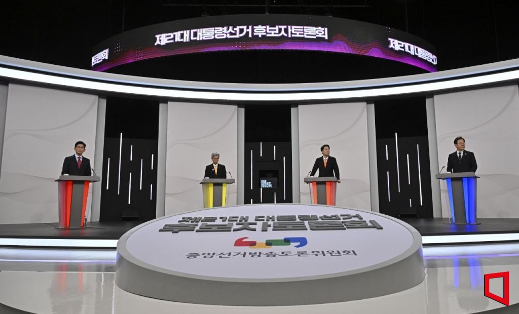 이재명(오른쪽부터) 더불어민주당·이준석 개혁신당·권영국 민주노동당·김문수 국민의힘 대선 후보가 중앙선거방송토론위원회 주관으로 18일 서울 상암동 SBS 프리즘센터 스튜디오에서 열린 제21대 대선 1차 후보자 토론회를 준비하고 있다. 2025.5.18 국회사진기자단