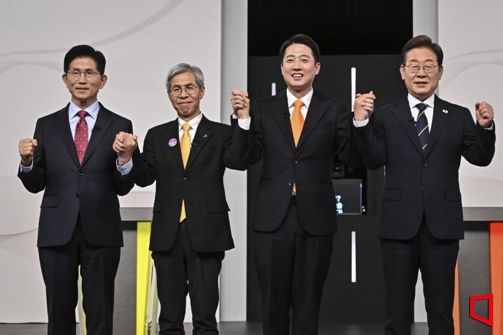 이재명(오른쪽부터) 더불어민주당·이준석 개혁신당·권영국 민주노동당·김문수 국민의힘 대선 후보가 중앙선거방송토론위원회 주관으로 18일 서울 상암동 SBS 프리즘센터 스튜디오에서 열린 제21대 대선 1차 후보자 토론회에서 기념 촬영을 하고 있다. 2025.5.18 국회사진기자단