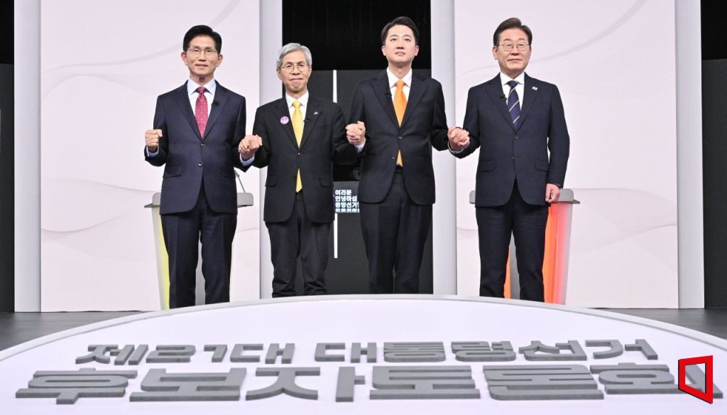 18일 서울 마포구 SBS프리즘타워에서 열린 중앙선거방송토론위원회 주관 제21대 대통령선거 후보자토론회에서 각 정당 대선 후보들이 선전을 다짐하고 있다. 왼쪽부터 국민의힘 김문수, 민주노동당 권영국, 개혁신당 이준석, 더불어민주당 이재명 대선후보. 2025.5.18 국회사진기자단