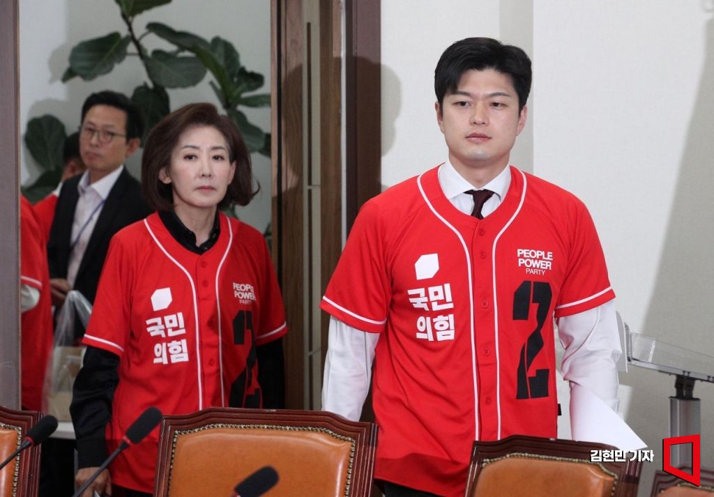 김용태 국민의힘 공동선거대책위원장이 19일 국회에서 열린 중앙선거대책위원회 회의에 참석하고 있다.