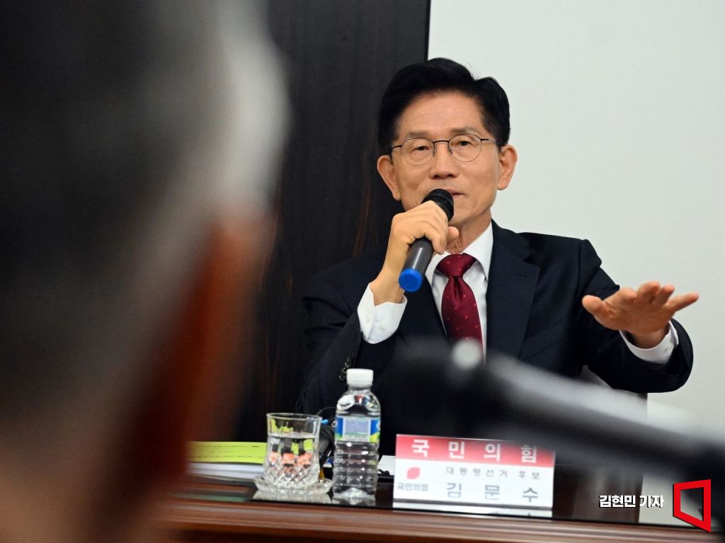 김문수 국민의힘 대선 후보가 19일 서울 중구 부영 태평빌딩에서 열린 대한노인회 간담회에서 인사말을 하고 있다.
