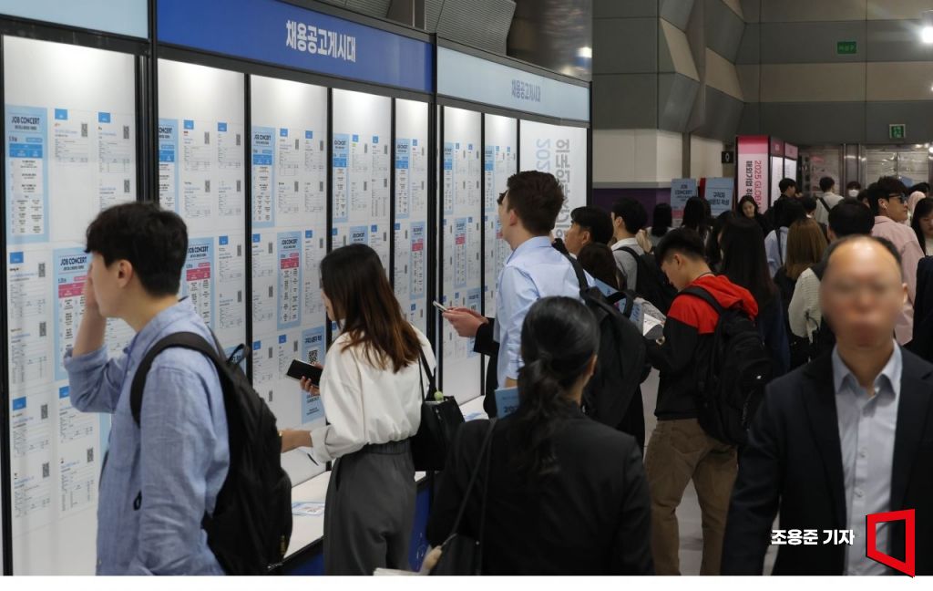 19일 서울 강남구 삼성동 코엑스에서 열린 '2025 글로벌 탤런트 페어'(Global Talent Fair)' 를 찾은 취업 준비생과 외국인 유학생들이 채용공고 게시판을 살펴보고 있다.