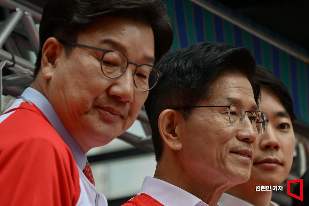 김문수 국민의힘 대통령 후보가 19일 ‘성년의 날’을 맞아 청년 정책 공약을 발표하기 위해 서울 중구 청계광장을 찾은 가운데 무대에 서서 권성동 공동선대위원장과 대화하고 있다. 2025.5.19 김현민 기자