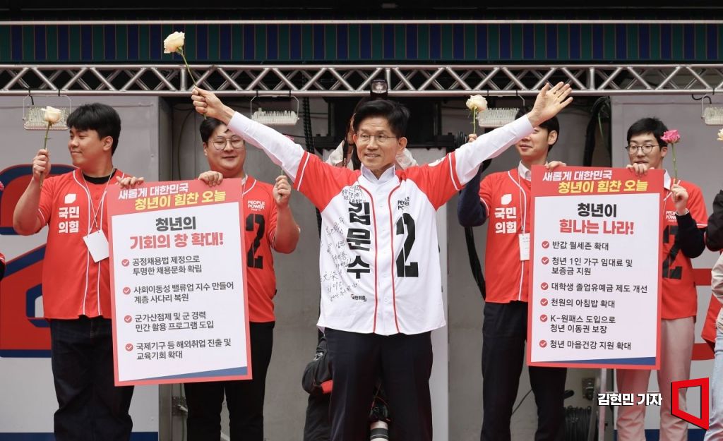 김문수 국민의힘 대선 후보가 19일 서울 중구 청계광장에서 열린 “청년이 바라는 대한민국“ 정책공약에 참석해 인사하고 있다.