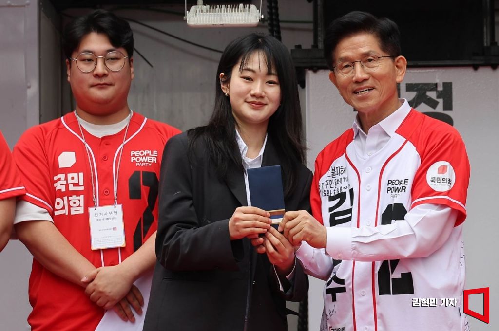 김문수 국민의힘 대선 후보가 19일 서울 중구 청계광장에서 열린 “청년이 바라는 대한민국“ 행사에서 한 청년으로부터 응원 편지를 받은 뒤 기념촬영을 하고 있다.
