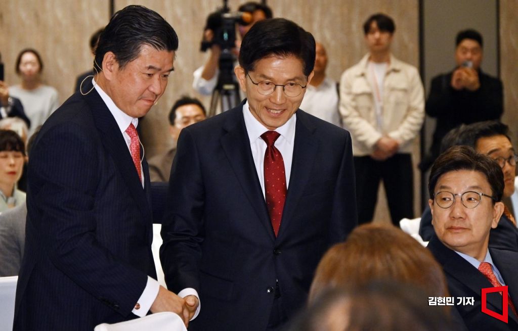 김문수 국민의힘 대선 후보와 제임스 김 주한미국상공회의소(AMCHAM·암참) 회장이 19일 서울 종로구 포시즌스호텔에서 열린 암참 초청 특별 오찬 간담회에 참석하고 있다.