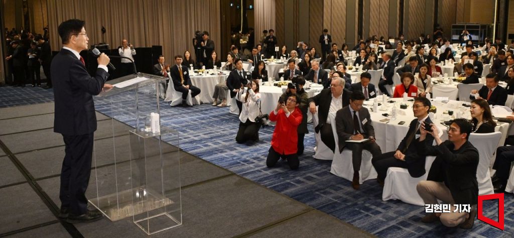 김문수 국민의힘 대선 후보가 19일 서울 종로구 포시즌스호텔에서 열린 주한미국상공회의소(AMCHAM·암참) 초청 특별 오찬 간담회에서 발언을 하고 있다.