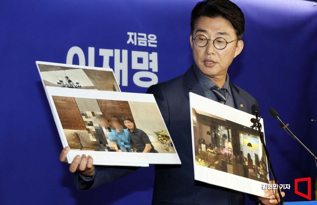 노종면 더불어민주당 의원이 19일 서울 여의도 중앙당사에서 지귀연 서울중앙지법 부장판사의 '룸살롱 접대' 의혹 관련 사진을 공개하고 있다. 민주당 중앙선대위는 이날 "지 판사가 룸살롱 접대 의혹과 관련해 룸살롱 출입 자체를 부인했다"며 "이와 관련해 사진 공개를 결정했다고 밝혔다.
