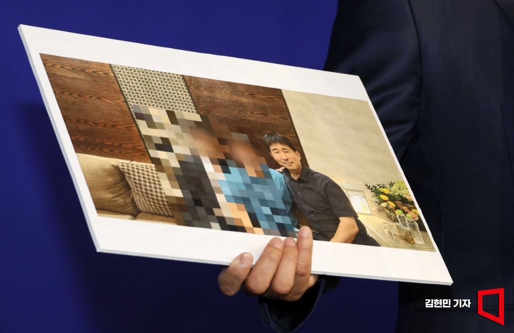 노종면 더불어민주당 의원이 19일 서울 여의도 중앙당사에서 지귀연 서울중앙지법 부장판사의 '룸살롱 접대' 의혹 관련 사진을 공개하고 있다. 민주당 중앙선대위는 이날 "지 판사가 룸살롱 접대 의혹과 관련해 룸살롱 출입 자체를 부인했다"며 "이와 관련해 사진 공개를 결정했다고 밝혔다.
