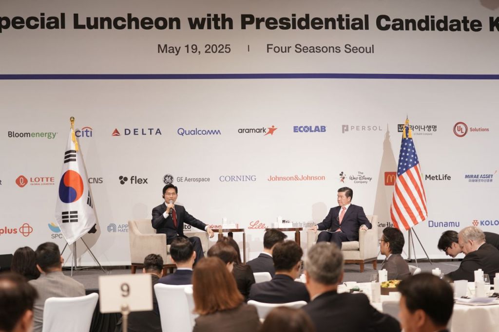 제임스 김 암참 회장은 이날 "한국이 국내외 복합적인 정치적 도전에 직면해있다"며 "다가오는 대선이 몇 주 안 남아 중대한 분수령이 될 것"이라고 밝혔다. 이어 "김 후보의 날카로운 통찰력과 흔들림 없는 원칙, 혁신과 경제 발전 분야에서 보여주신 선도적인 리더십을 오랜 시간 존경해 왔다"며 "오늘 이 자리를 통해 한국이 아·태지역 제1의 비즈니스 허브이자 미국의 핵심 경제 파트너로 자리매김할 수 있는 방안에 대해 심도 있는 논의가 이루어지기를 기대한다"고 밝혔다.