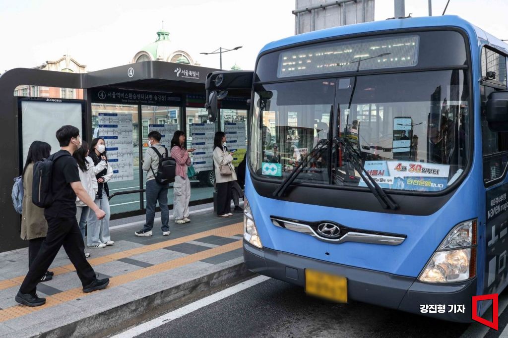 서울 시내버스 노사 간 협상이 결렬되면서 노조가 준법운행 쟁의행위에 돌입한 30일 서울 중구 서울역버스환승센터 버스에 쟁의행위 관련 안내문이 부착돼 있다. 2025.4.30. 강진형 기자