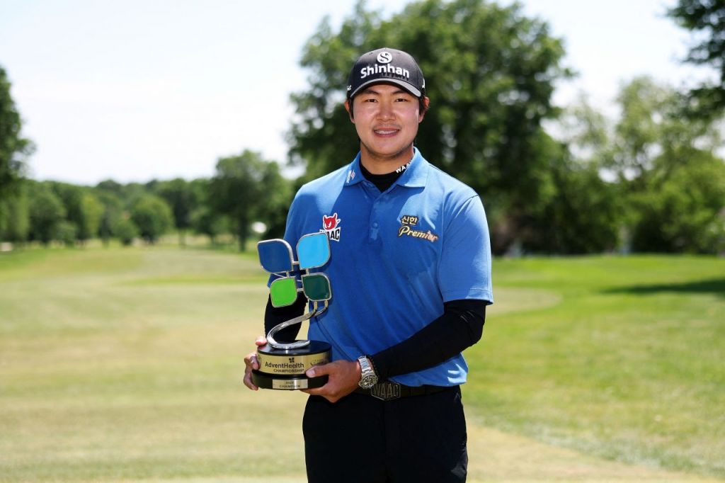 김성현이 콘페리 투어 어드벤트헬스 챔피언십 우승 직후 트로피를 들고 미소를 짓고 있다. 캔자스시티=AFP연합뉴스
